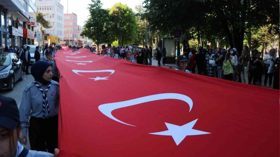 Pandemi dolayısıyla 2 yıldır yapılamayan yürüyüş bu yıl coşku içinde gerçekleştirildi. 1919 metrelik dev bayrağın binlerce kişi tarafından taşınması dron ile havadan görüntülendi.