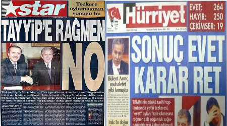 Başbakan Erdoğan, "Tezkere geçse de geçmese de ABD'nin harekatta kararlı olduğunu, Türkiye'nin 2003 yılı içinde 73 milyar dolar borç ödemesi gerektiğini" söylemiş ve "tezkerenin çıkmaması halinde Türkiye'nin ekonomik olarak çok sıkıntıya gireceğini" ifade ederek 'tezkereye hayır demek bana hayır demektir" demiş, 'tezkere geçmezse memur maaşlarını ödeyemeyiz' diye de eklemişti. Buyurun övünün…