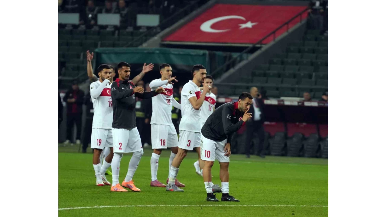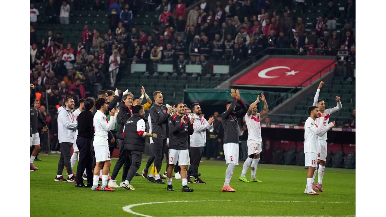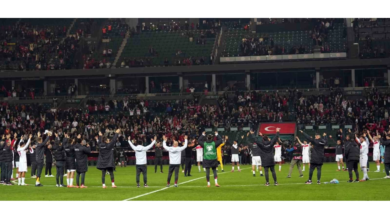 A Milli Futbol Takımı, Gürcistan galibiyetinin ardından sahanın ortasında toplanarak hep birlikte taraftarlara üçlü çektirdi.