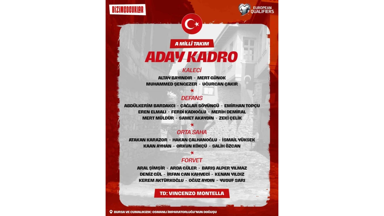 2026 FIFA Dünya Kupası Elemeleri'nde 15 Kasım'da Bursa'da Bulgaristan ve 18 Kasım'da deplasmanda İspanya ile karşılaşacak A Milli Futbol Takımı'nın 28 kişilik aday kadrosu belli oldu