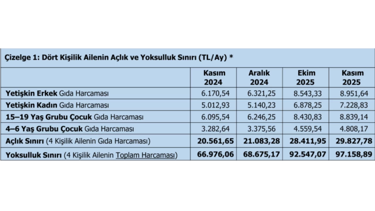 TÜRK-İŞ Konfederasyonu tarafından yapılan araştırmanın 2025 Kasım ayı sonucuna göre, "açlık sınırı" 29 bin 827.78 TL’ye, yoksulluk sınırı ise 97 bin 158.89 TL’ye yükseldi.