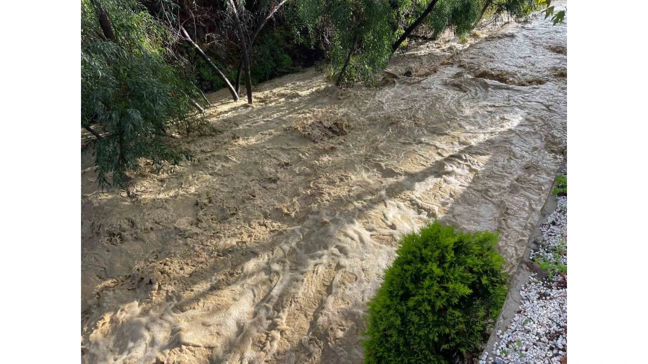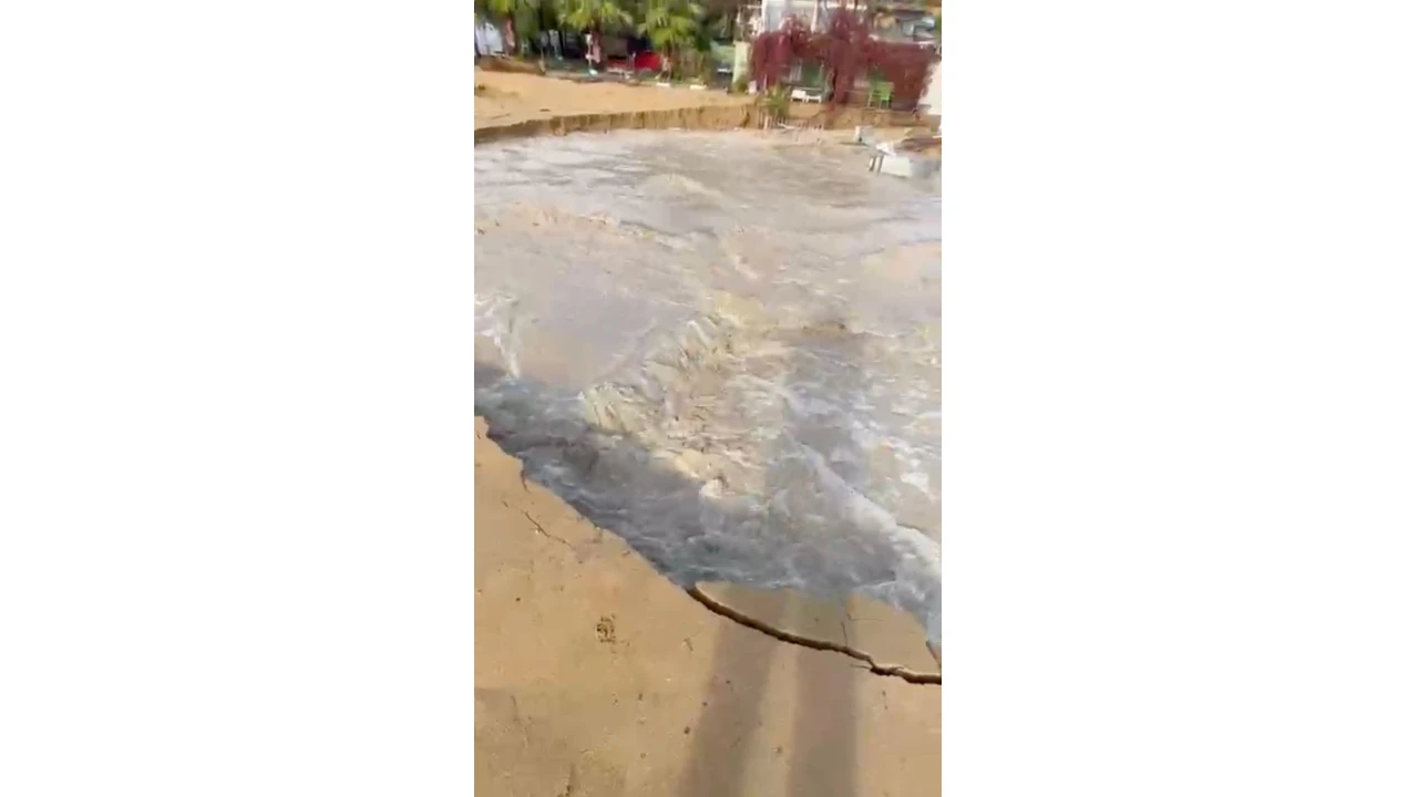 Bölgedeki Ölükler Deresi de şiddetli yağmur nedeniyle taştı. Taşan derenin suları, sahilde 5 yıldızlı bir otele ait olan ve açılışa hazırlanan kafeyi adeta yerle bir etti.