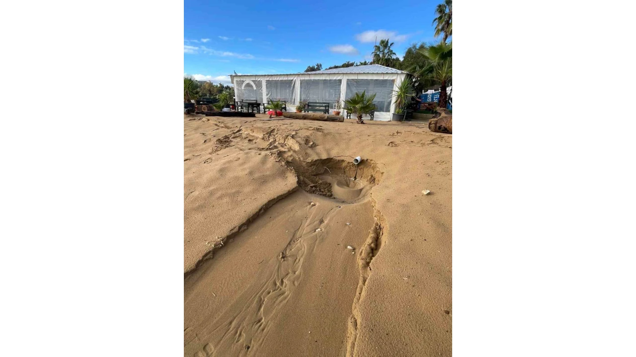 Kafedeki ocak, dolap gibi malzemeler suyla sürüklenerek ortalığa saçılırken, dereden taşan sular sahildeki kumları da denize taşıdı.