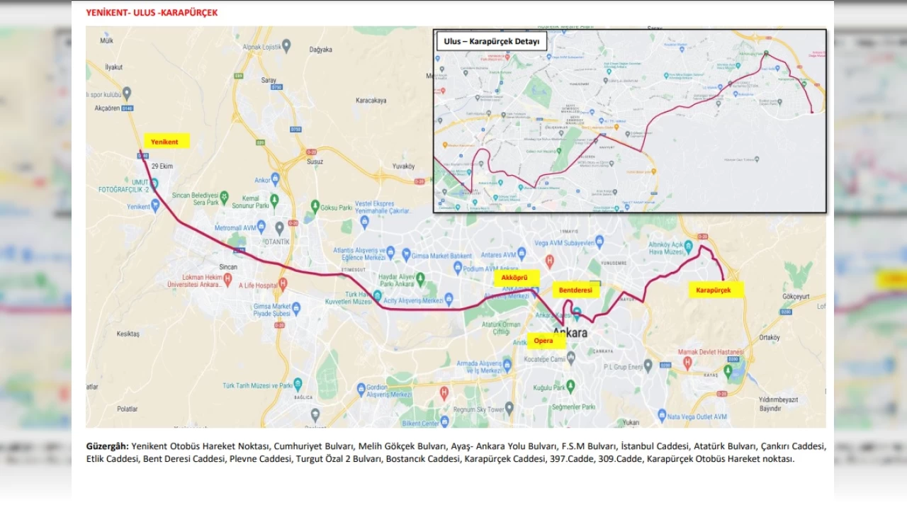 İlk etapta 200 bin yolcuyla hizmete başlayacak olan e-BRT projesinin 2035 yılında 300 bin Başkentliye hizmet vereceği öngörülürken, projenin güzergâhı, Yenikent merkez, Ayaş Yolu, İstanbul Yolu, Yenimahalle Kavşağı, Ulus ve Karapürçek Mahallesi olarak belirlendi.
