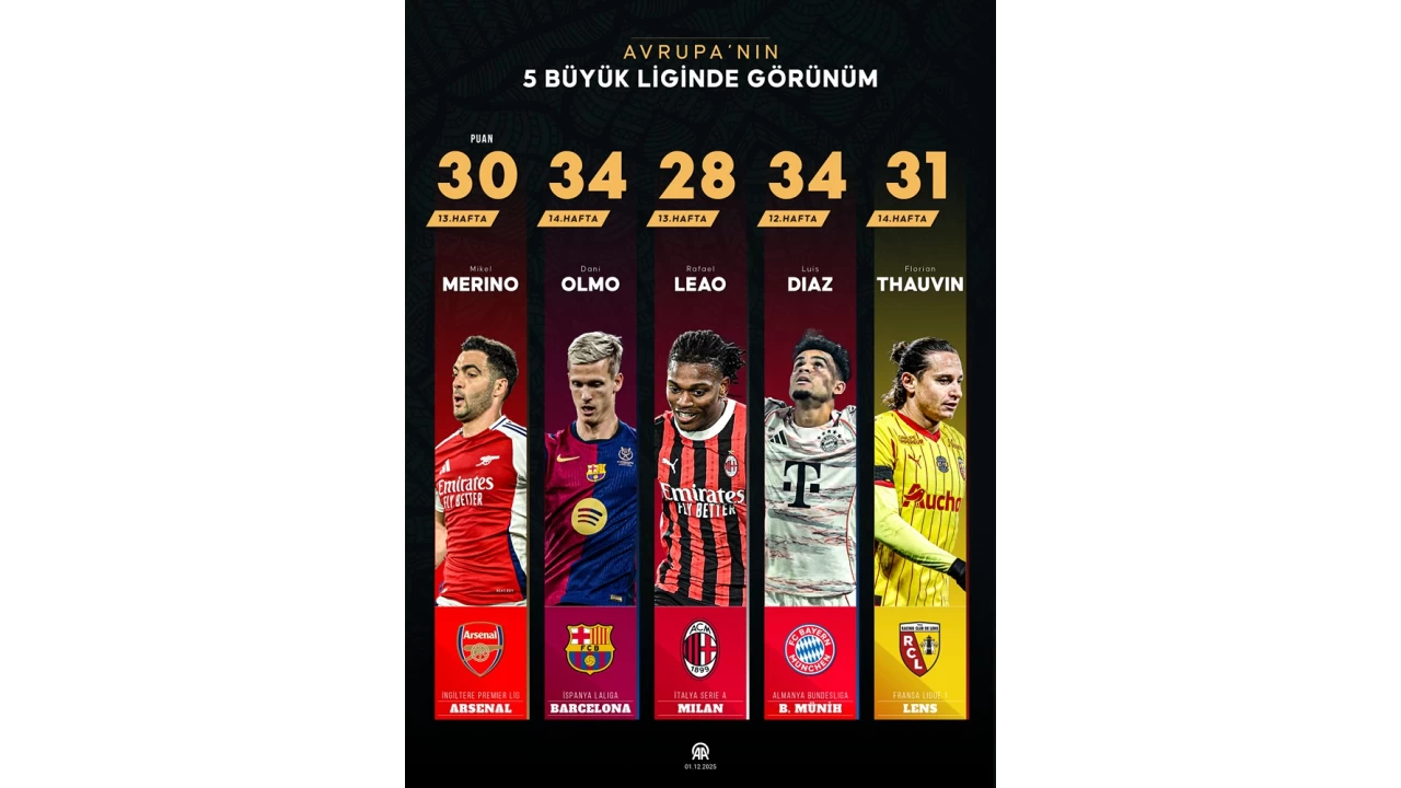 LaLiga'da Barcelona, Serie A'da Milan ve Ligue 1'de Lens, liderliğe yerleşti. Premier Lig'de Arsenal, Bundesliga'da ise Bayern Münih, zirvedeki yerini korudu.