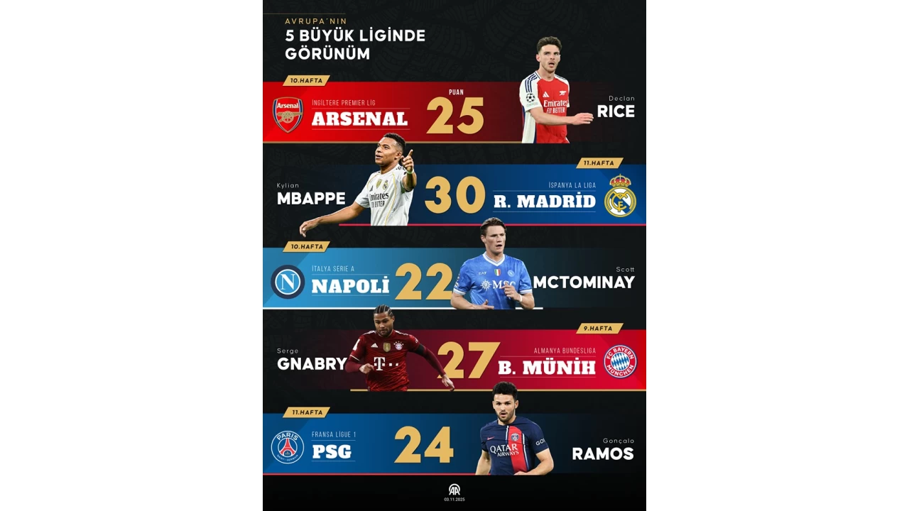 İspanya'da Real Madrid, İngiltere'de Arsenal, İtalya'da Napoli, Almanya'da Bayern Münih ve Fransa'da Paris Saint-Germain (PSG), puan tablosunun zirvesinde yer aldı.
