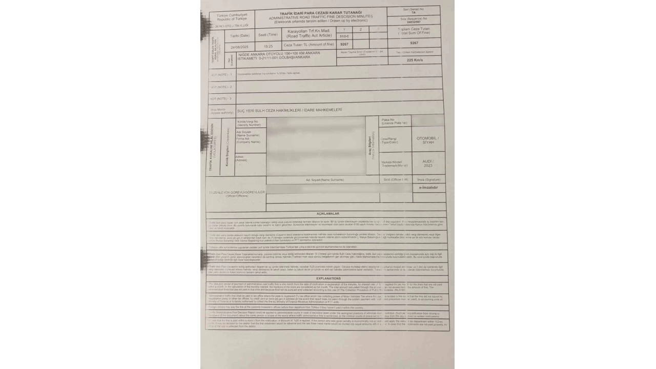 Ulaştırma ve Altyapı Bakanı Abdulkadir Uraloğlu, Ankara-Niğde Otoyolu'nda hız sınırını aştığı için radar cezasına çarptırıldı.