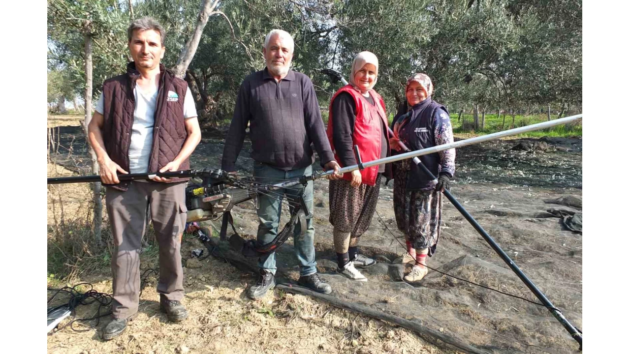 Burhaniye de zeytinliklerde hasat başlarken, pek çok üreticide hasatta makine kullanımına başladı. Makineler, hasatta büyük kolaylık sağlarken, genç dalları kırmadığı içinde verimin artmasına neden oluyor. Üretici Lütfü Mert de, Ziya Uysal, Gülten Semiz ve Birgül Güllü'den oluşan ekibi ile zeytin hasadı yapıyor.