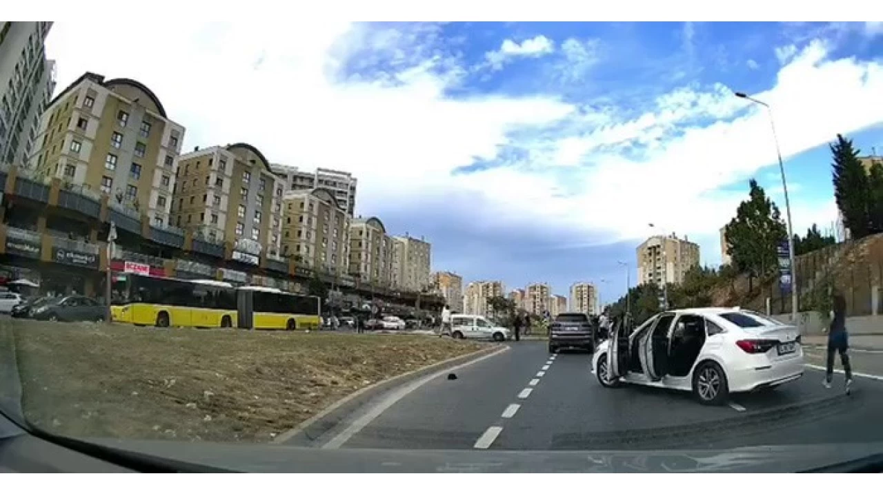 Korkunç anlar, çevrede seyir halinde olan başka bir aracın kamerasına yansıdı. Görüntülerde, sürücü aracından inerek diğer aracın sürücüsüne yöneliyor.