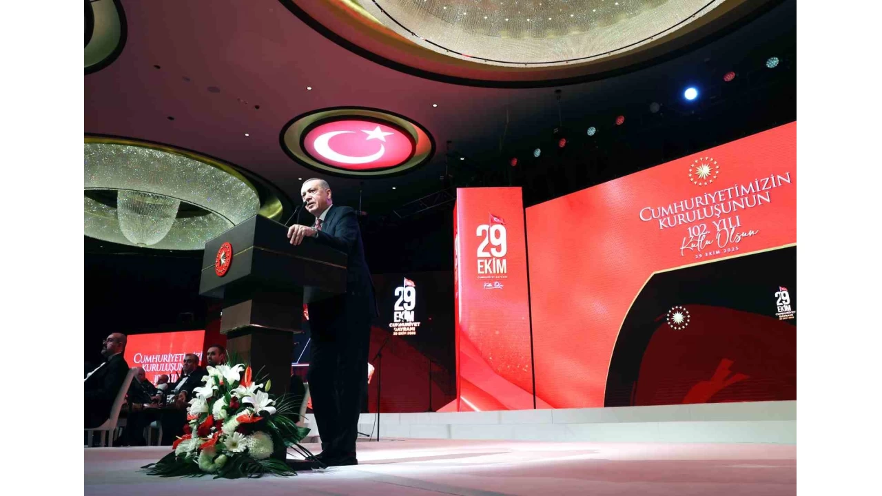 Cumhurbaşkanı Recep Tayyip Erdoğan, Cumhurbaşkanlığı Külliyesi Sergi Salonu'nda düzenlenen 29 Ekim Özel Programı'nda yaptığı konuşmada, "Millet ve devlet hafızasında müstesna bir yer tutan bu önemli günde sizlerle bir arada olmaktan, sizleri burada ağırlamaktan büyük memnuniyet duyuyorum. Cumhurbaşkanlığı Külliyemize, milletin evine, bu gazi mekâna hepiniz hoş geldiniz, şeref verdiniz. Sizlerin şahsında 86 milyon vatandaşımıza, Kıbrıs Türk halkına, dünyanın dört bir yanındaki Türk diasporası mensuplarına ve gönül coğrafyamızdaki kardeşlerimize selamlarımı, sevgilerimi gönderiyorum" dedi.