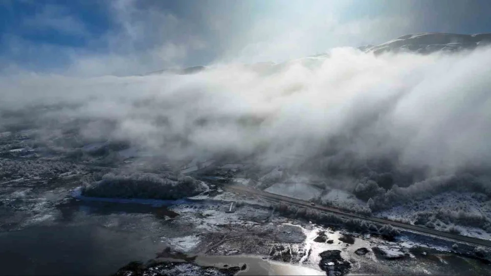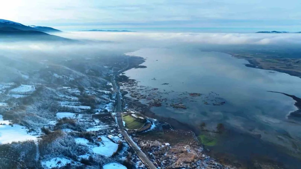 Beyaz örtünün hâkim olduğu göl ve çevresi, dron ile görüntülendi. Havadan kaydedilen karelerde gölün sakinliği ve doğal güzelliği net şekilde ortaya çıktı.