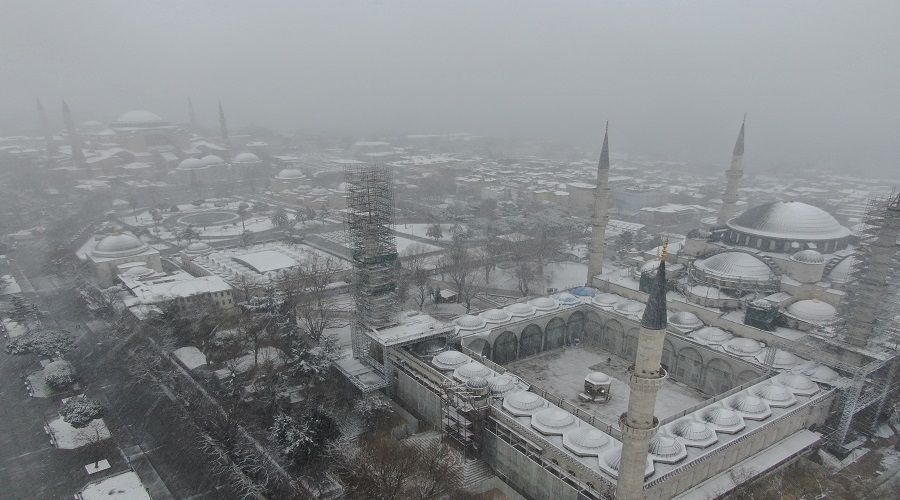 Beyaz gelinliğini giyen tarihi yarımada havadan görüntülendi. Beyaz örtü ile kaplanan tarihi yarımada kartpostallık görüntüler oluşturdu.
