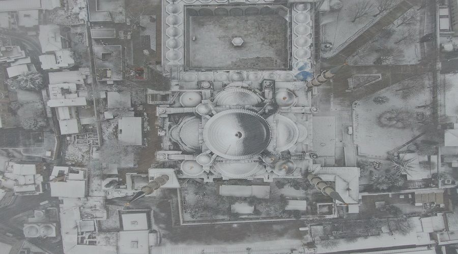 İstanbul'da dün akşam saatlerinden beri etkili olan kar yağışı Sultanahmet Camii, Ayasofya ve Topkapı Sarayı'nın üzerini beyaz örtü ile kapladı. Beyaz gelinliğini giyen tarihi yarımada havadan görüntülendi.