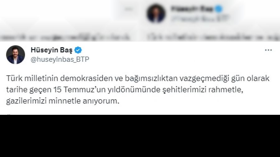 Hüseyin Baş twitter hesabından şu paylaşımı yaptı, "Türk milletinin demokrasiden ve bağımsızlıktan vazgeçmediği gün olarak tarihe geçen 15 Temmuz'un yıldönümünde şehitlerimizi rahmetle, gazilerimizi minnetle anıyorum."