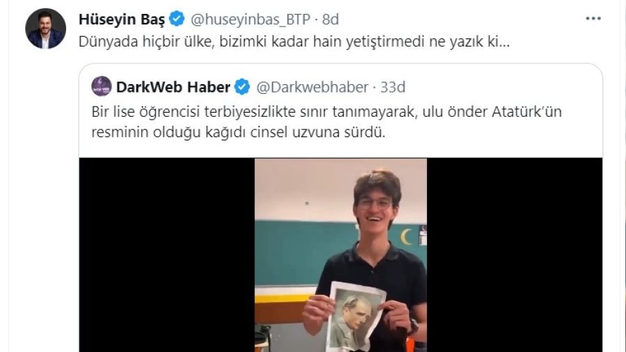 Bağımsız Türkiye Partisi (BTP) Genel Başkanı Hüseyin Baş Marmara İmam Hatip Lisesi öğrencisi olduğu ileri sürülen şahsın Atatürk'e yaptığı hakarete tepki gösterdi.