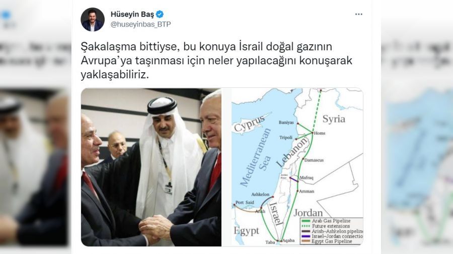 Hüseyin Baş sosyal medya hesabından yaptığı paylaşımda, "Şakalaşma bittiyse, bu konuya İsrail doğal gazının Avrupa'ya taşınması için neler yapılacağını konuşarak yaklaşabiliriz" İfadelerini kullandı.