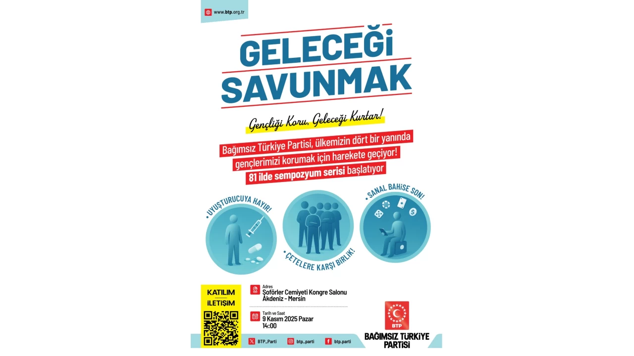 Bağımsız Türkiye Partisi Mersin İl Başkan Vekili Garipcan Coşgun, "Türkiye genelinde gençlerimizi uyuşturucu, sanal bahis ve çeteleşme gibi tehlikelere karşı korumak adına Genel Başkanımız Hüseyin Baş öncülüğünde başlattığımız 'Geleceği Savunmak' programımızı 9 Kasım'da Mersin'de yapacağız" dedi
