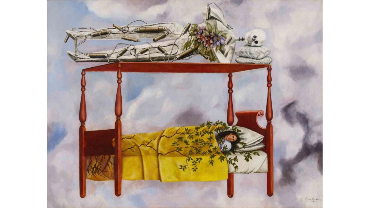 "El sueno (La cama)" adlı otoportrede, Kahlo bulutların üzerinde süzülen bir yatakta uyurken tasvir ediliyor. Kahlo, altın bir battaniyeye sarılı, yeşil sarmaşıklar ve yapraklarla sarmalanırken yatağın üzerinde dinamitle sarılmış farklı çiçeklerle sarmalanan bir iskelet figürü yatıyor.