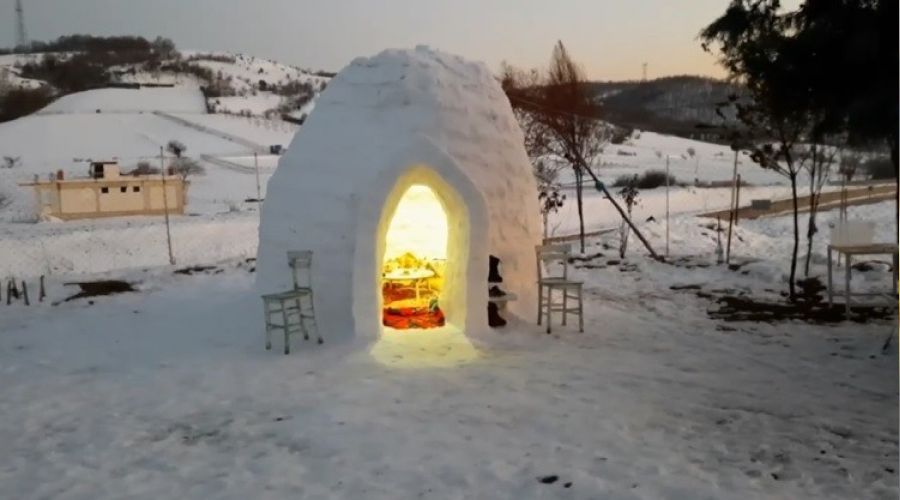 Bursa'nın İznik ilçesinde oturduğu mahalleye eskimo evi yapan emekli öğretmenin kapısından misafiri eksik olmuyor. Torunlarıyla birlikte 4 günde tamamladığı eskimo evine ailece taşınan Mümin Ergül; kardan evde sıra gecesi bile yapıyor