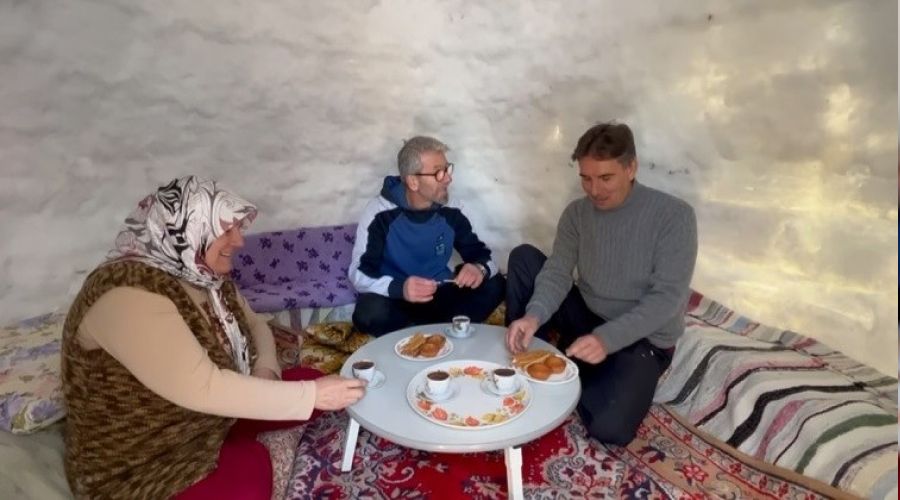 Aydınlanınca gece lambasını andıran eskimo evinde ailesiyle bir araya gelen Ergül; kardan evde cep telefonundan dinlediği türküler eşliğinde sıra gecesi yapıp ailesiyle ziyafet çekiyor. Mahalle halkının yoğun ilgisini çektiğini için kapısından misafirinin eksik olmadığını belirten emekli öğretmen kardan evin eriyene kadar keyfini sürmek istediklerini söyledi.