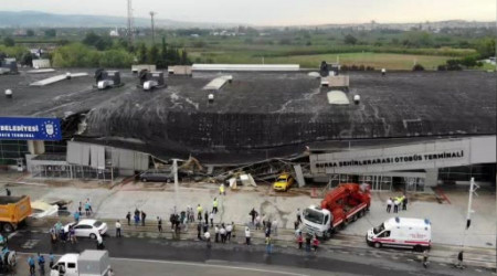 Bursa'da şiddetli yağış ve fırtına uyarılarının ardından yağan sağanak yağmur hayatı felç etti. Şehirlerarası Otobüs Terminali'nin çatısı ise fırtına ve yıldırım düşmesi sonucu çöktü. Olayda yaralanan olmazken, 3 araç hasar gördü. Çatısı çöken Şehirlerarası Otobüs Terminali'nin son hali ise dron ile havadan görüntülendi.