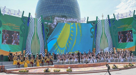 Başkent Nur Sultan'daki Expo Fuarı Merkezi alanında düzenlenen konserde yüzlerce sanatçı aynı anda geleneksel müzik enstrümanı dombra çalarak çeşitli halk ezgilerini seslendirdi.