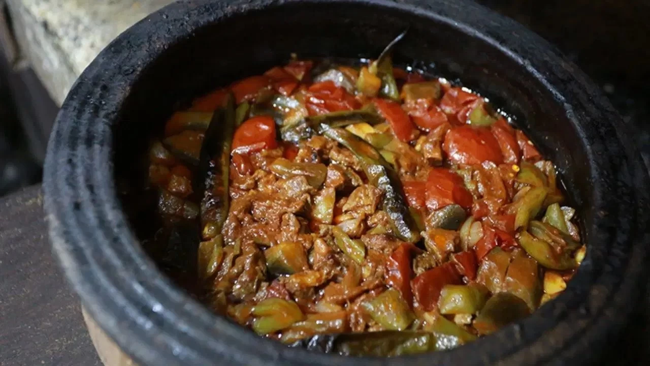 1. Tüm sebzeler doğranır, etle birlikte toprak güvece yerleştirilir.