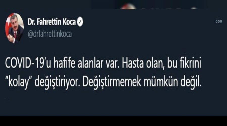 Sağlık Bakanı Fahrettin Koca Twitter hesabından gün içerisinde uyarılarda bulunmaya devam etti. Bakan Koca daha önceki paylaşımlarında havaların soğuduğuna ve maske kullanımının daha da önemli hale geldiğine dikkat çeken paylaşımlar yaptı. Son yaptığı paylaşımda ise, "Covid-19'u hafife alanlar var. Hasta olan, bu fikrini 'kolay' değiştiriyor. Değiştirmemek mümkün değil" ifadelerini kullandı.İHA