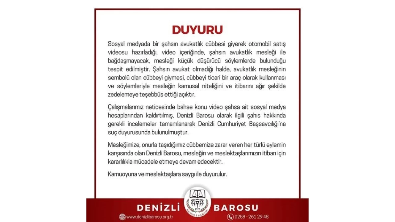 "Sosyal medyada bir şahsın avukatlık cübbesi giyerek otomobil satış videosu hazırladığı, video içeriğinde, şahsın avukatlık mesleği ile bağdaşmayacak, mesleği küçük düşürücü söylemlerde bulunduğu tespit edilmiştir. Şahsın avukat olmadığı halde, avukatlık mesleğinin sembolü olan cübbeyi giymesi, cübbeyi ticari bir araç olarak kullanması ve söylemleriyle mesleğin kamusal niteliğini ve itibarını ağır şekilde zedelemeye teşebbüs ettiği açıktır.