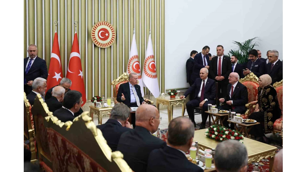 TBMM Başkanı Numan Kurtulmuş ev sahipliğinde TBMM'de yasama yılı açılışı dolayısıyla resepsiyon düzenlendi. Resepsiyonda mermerli salonda liderler zirvesi düzenlendi.