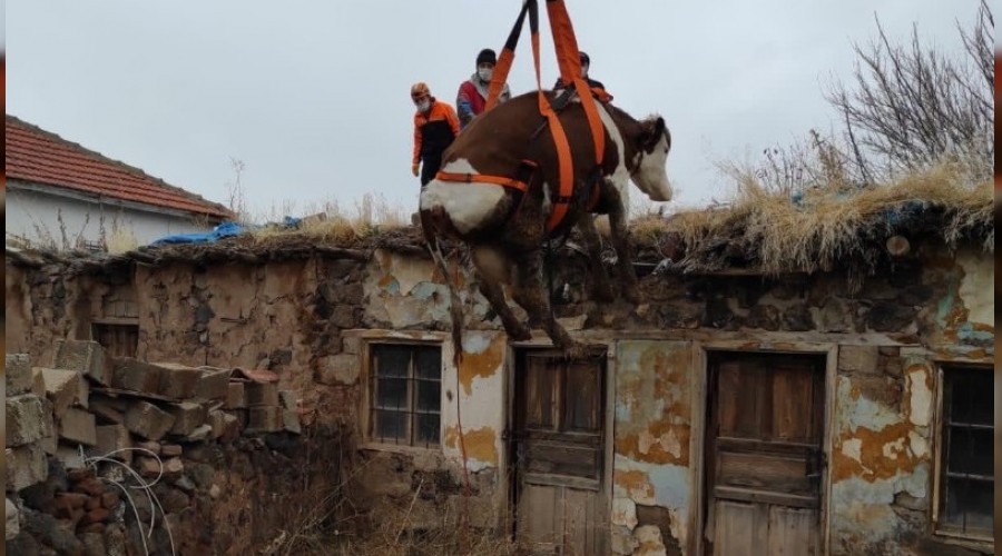 Olay, merkeze bağlı Sağlık köyünde meydana geldi. Edinilen bilgiye göre, Dursun Uslu'ya ait inek tek katlı kerpiç evin damına çıktı. İneğin damda olduğunu fark eden ev sahibi, hayvanı indirmek için uğraş verse de başarılı olamayınca Aksaray AFAD Müdürlüğünden yardım istedi. İhbar üzerine adrese giden AFAD ekipleri, halatla bağladıkları hayvanı vinç yardımıyla damdan aşağıya indirdi. Hayvan sahibi AFAD ekibine teşekkür etti.İHA