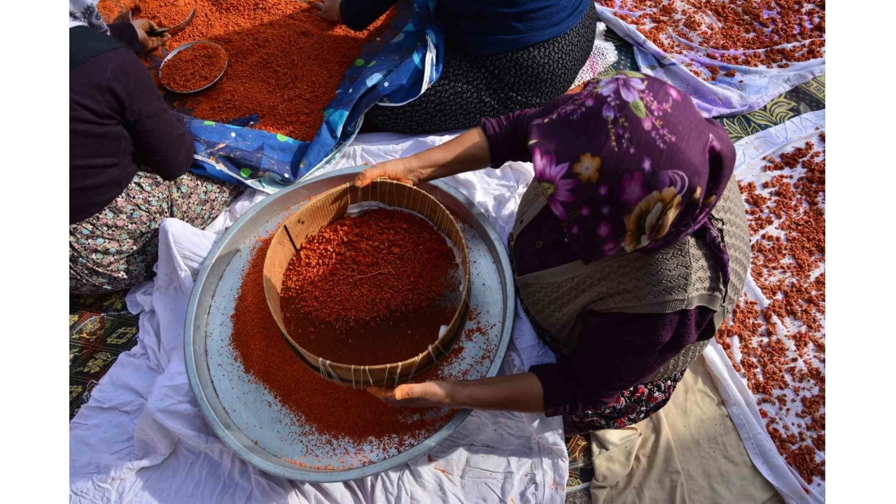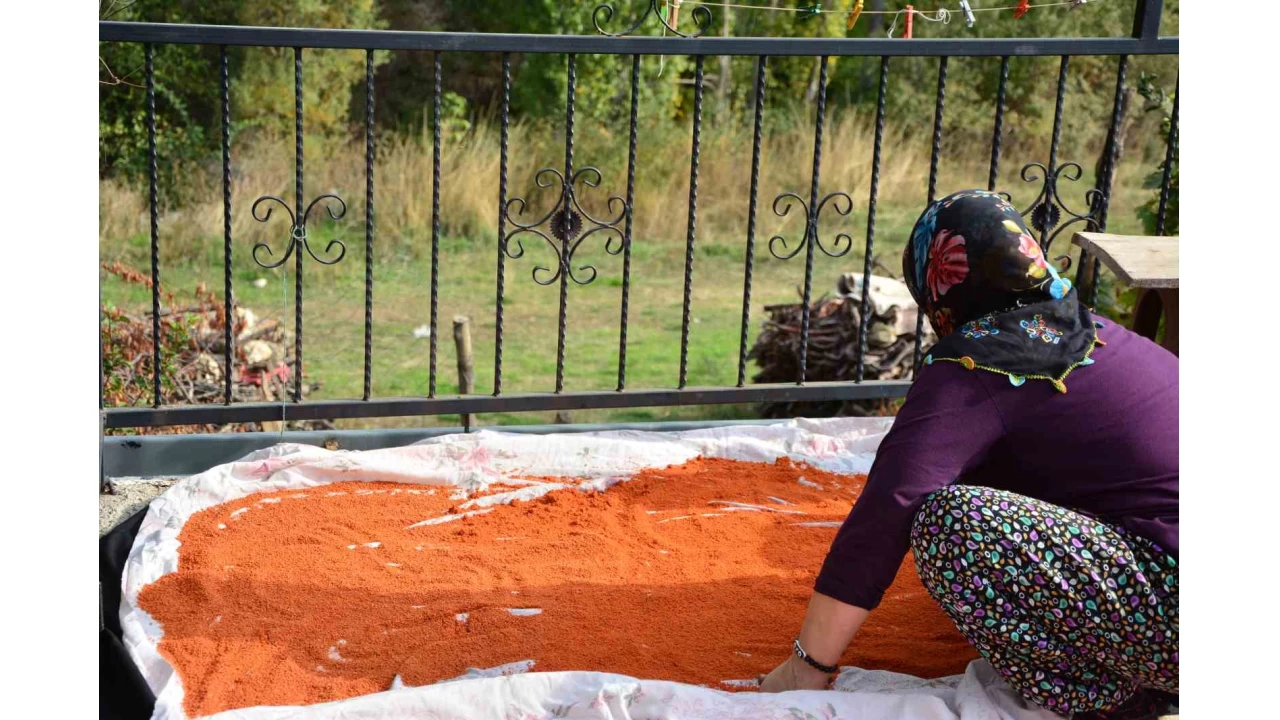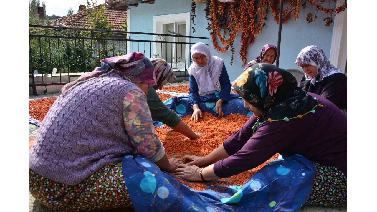 İlçeye bağlı Akdere Mahallesinde kadınlar kış mevsiminin yaklaşması ile kışlık olarak tüketilecek ürünleri imece usulü ile el birliği halinde hazırlıyorlar.