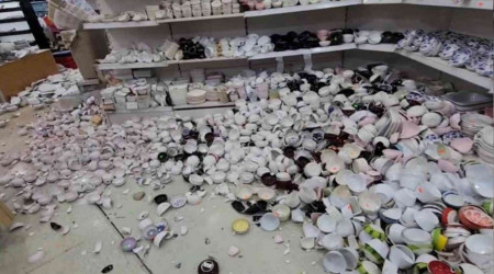 Düzce'nin Gölyaka ilçesinde meydana gelen depremin ardından market ve züccaciye dükkanında bulunan ürünler devrilerek, zarar gördü. Cam ve yapı malzemelerinin satıldığı iş yerinde de birçok cam kırıldı.