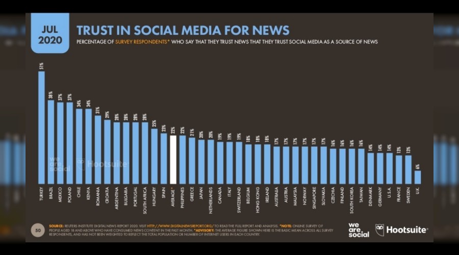 Türkiye'de 13 yaş üstü nüfusta sosyal medya kullanım oranının yüzde 79 olduğunu hatırlatan Turgud, 'Bu çok ciddi bir oran, üstelik 16-64 yaş arası sadece sosyal medya kullanım süresi ortalama olarak 3 saat 5 dakika, bu da dünya ortalamasının üstünde. Türkiye olarak son olarak sosyal medya haberlerine güven oranı yüzde 51, yani dünyada sosyal medyadan duyduğu haberlere en çok inanan ülkeyiz. Bizden sonraki ülke Brezilya. Onlardaki oran yüzde 38, yani her yüz insandan 38'i sosyal medyadan duyduğu haberlere inanıyor. Bu rakam Birleşik Krallıkta sadece yüzde 6. Bu da Türkiye olarak sosyal medya kullanımı konusunda daha bilinçli olmamız gerektiği anlamına geliyor' diye konuştu.