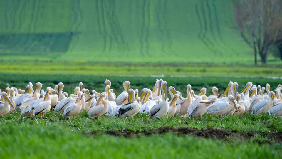 Göç yolundaki pelikan sürüsünün Bursa molası