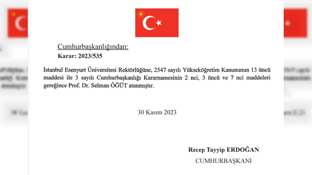 Çeşitli bakanlıklarda başmüfettiş ve müfettiş atamalarının yapıldığı kararnameyle Prof. Dr. Selman Öğüt, İstanbul Esenyurt Üniversitesi Rektörlüğüne, Prof. Dr. Güliz Muğan İstanbul Okan Üniversitesi Rektörlüğüne, Prof. Dr. Mehmet Yazıcı Antalya Belek Üniversitesi Rektörlüğüne, Prof. Dr. İsmail Boz ise Bandırma Onyedi Eylül Üniversitesi Rektörlüğüne atandı.