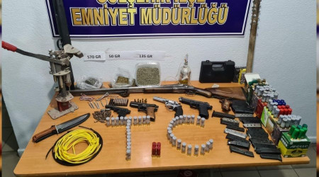 Edinilen bilgiye göre ilçede bir kadına cinsel saldırıda bulunduğu iddiasıyla yakalanarak gözaltına alınan Y.Y. isimli şahsın ikametinde ve aracında arama yapıldı. Gülşehir İlçe Emniyet Müdürlüğü ekiplerince yapılan aramalarda; 2 paket halinde toplam 185 gram esrar, 1 adet ruhsatsız tabanca ve şarjörü 1 adet ruhsatsız tabanca ve tabanca içerisinde 10 adet şarjöre basılı fişek, 1 adet ruhsatsız 9 mm çapında toplu tabanca, 1 adet ruhsatsız kurusıkı tabanca ve 39 kurusıkı fişeği, 1 adet ruhsatsız av tüfeği, 10 kutu içerisinde toplam 238 adet av fişeği, 23 içi boş tabanca şarjörü, 1 adet fişek basma makinesi, içi sıvı dolu alüminyum folyo kaplı cam şişe içerisinde uyuşturucu madde içiminde kullanılan düzenek, 570 gram patlayıcı yapımında kullanılan kimyasal madde ve 6 adet fünye, yaklaşık 10 metre fünye fitili, 1 adet av bıçağı, üzerine 19 adet cıvata çakılmış sopa ele geçirildi.