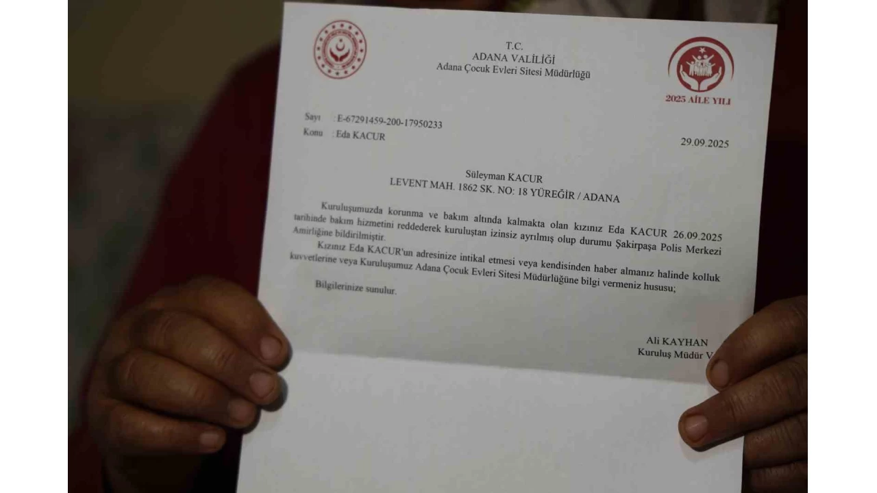 Öte yandan, ailenin evine de Çocuk Evleri Sitesi Müdürlüğü'nden gönderilen evrakta, "Kuruluşumuzda korunma ve bakım altında kalan kızınız Eda, 26.09.2025 tarihinde bakım hizmetini reddederek kuruluştan izinsiz ayrılmış olup durumu Şakirpaşa Polis Merkezi Amirliğine bildirilmiştir. Kızınız Eda'nın adresinize intikal etmesi veya kendisinden haber almanız halinde kolluk kuvvetlerine ve kuruluşumuz Adana Çocuk Evleri Sitesi Müdürlüğüne bilgi veriniz" denildi.