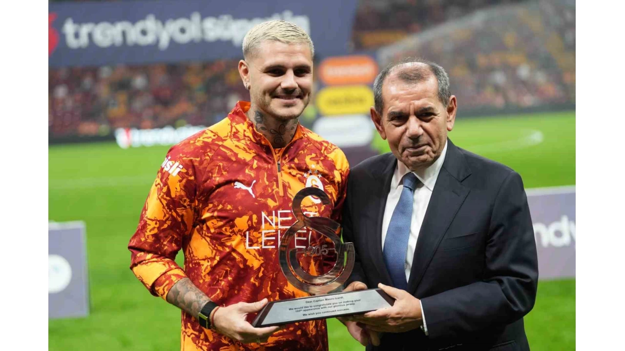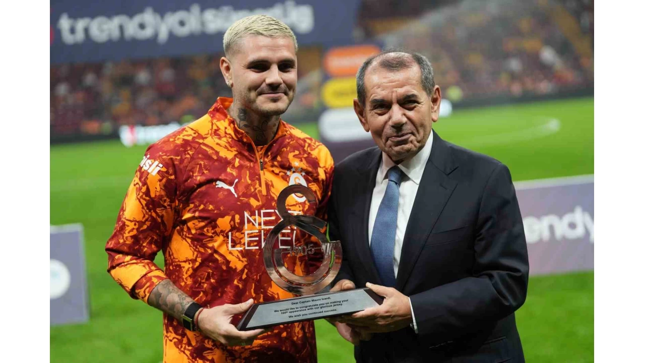 Süper Lig'in 11. haftasında RAMS Park'ta yapılan Trabzonspor mücadelesiyle sarı-kırmızılılarda 100. resmi maçına çıkan Icardi'ye, Galatasaray Başkanı Dursun Özbek, saha kenarında plaket ve üzerinde 100 yazılı sarı-kırmızılı forma takdim etti.