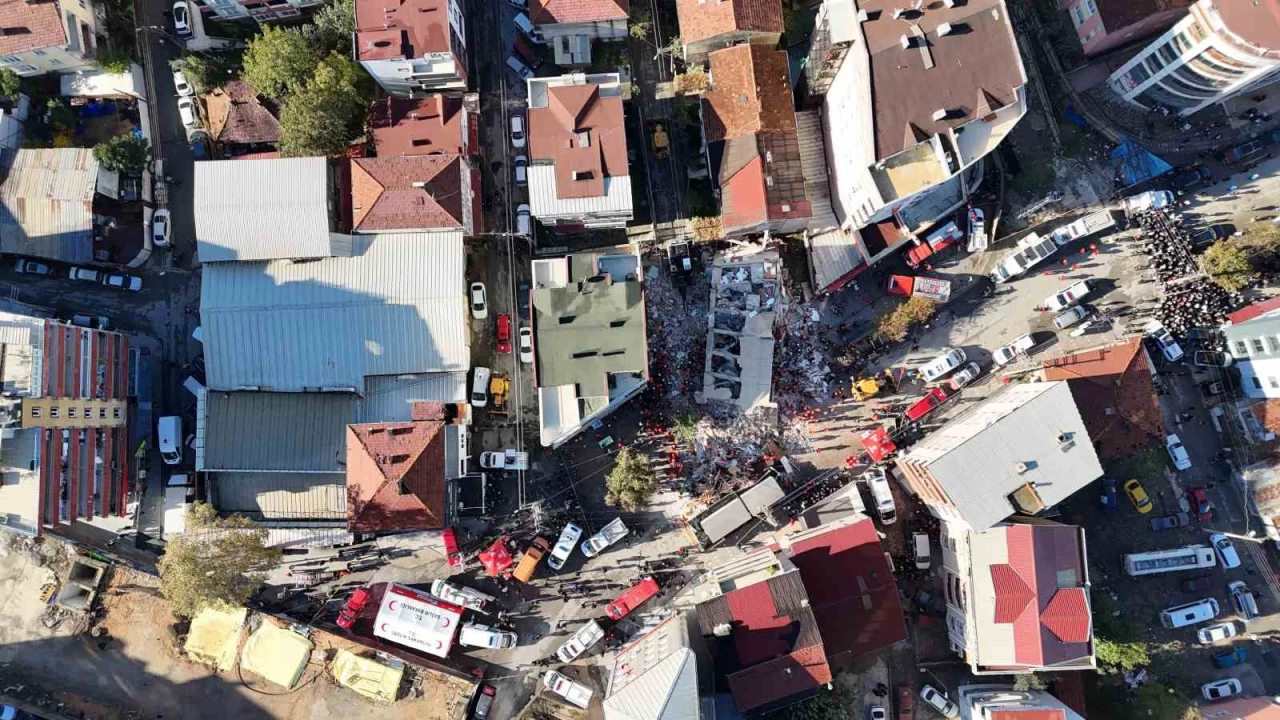 Kocaeli'nin Gebze ilçesinde çöken 6 katlı binanın enkazı ve ekiplerin arama kurtarma çalışmaları dron ile havadan görüntülendi