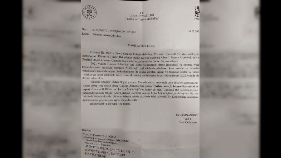 Mitolojik hikayeleri ve tarihi kalıntılarıyla ön plana çıkan Giresun Adası'na gezi yasağıyla ilgili Giresun Valiliği'nden ilgili kurumlara gönderilen yazıda, "Giresun Adası'nda yeni kültür varlıklarının ortaya çıkarılması ve turizme ivme kazandırılması amacıyla Müze Müdürlüğü başkanlığında planlanan kazı sondaj ve temizlik çalışmaları tamamlanmıştır. Bakanlığımızca da uygun görülen taşınır ve taşınmaz kültür ve tabiat varlıklarını açığa çıkarmak üzere temizlik sondaj ve kurtarma kazısı çalışmalarını 2022 yılında da devam edecektir.