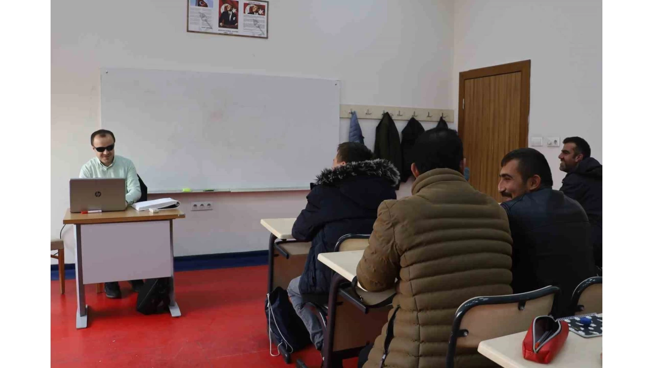 Sivas Halk Eğitim Merkezi Akşam Okulu'nda sınavlara hazırlık kursları başta olmak üzere birçok alanda ders veren görme engelli öğretmenler, mesleklerine olan aşklarıyla görme engelli diğer bireylere de hem örnek oluyor hem de umut veriyorlar.