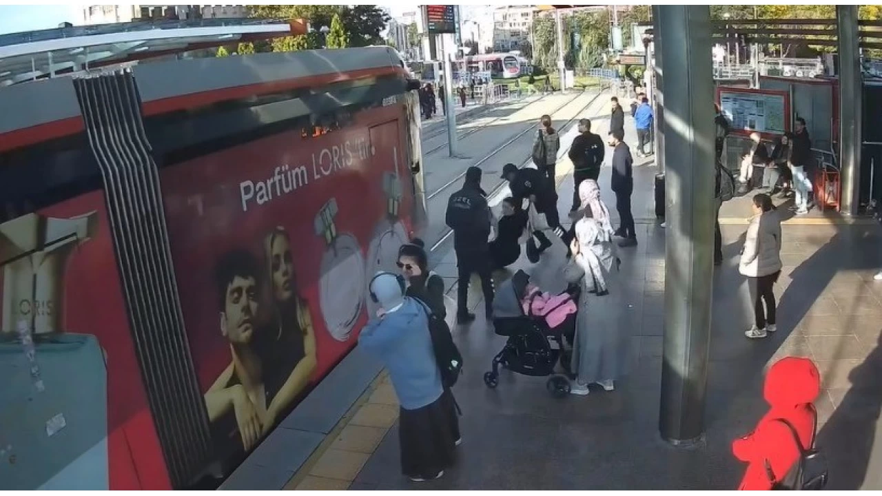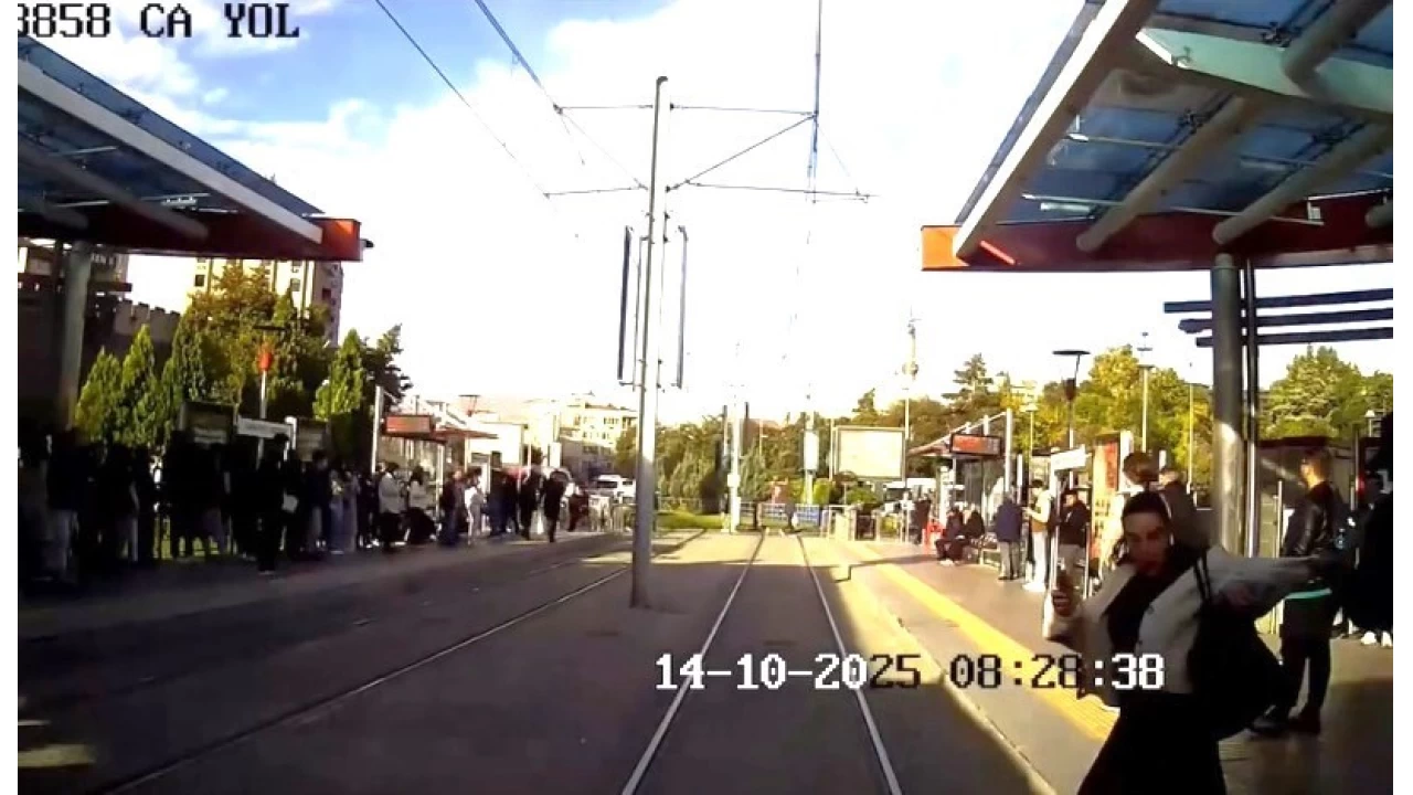 Durumu fark eden güvenlik görevlileri genç kızı çekerek tramvayın altında kalmaktan son anda kurtardı. Olay, güvenlik kamerası ve tramvay içi kamera tarafından saniye saniye kaydedildi.