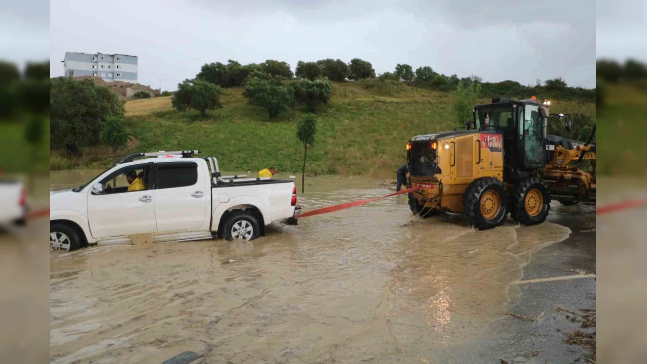 Hatay'da aşırı yağışla birlikte göle dönen yolda mahsur kalan araç büyükşehir belediyesi ekipleri tarafından kurtarıldı.