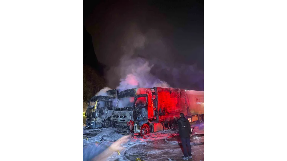 Artvin'in Hopa ilçesinde dün gece tır parkında çıkan yangında parkta bulunan 2 tır tamamen kullanılamaz hale geldi