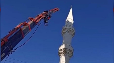 Mersin'in Erdemli ilçesinde yıkım kararı verilen caminin minaresi iş makinesinin dokunmasıyla birlikte devrildi. O anlar saniye saniye görüntülere yansıdı