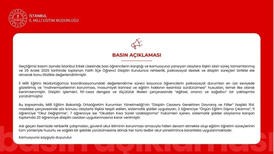 İstanbul İl Milli Eğitim Müdürlüğü sosyal medya hesabından yapılan açıklamada, "Geçtiğimiz Kasım ayında İstanbul Erkek Lisesinde bazı öğrencilerin karıştığı ve kamuoyuna yansıyan olaylara ilişkin idari süreç tamamlanmış ve 29 Aralık 2025 tarihinde toplanan Fatih İlçe Öğrenci Disiplin Kurulunca rehberlik, psikososyal destek ve disiplin süreçleri birlikte ele alınarak konu titizlikle değerlendirilmiştir.