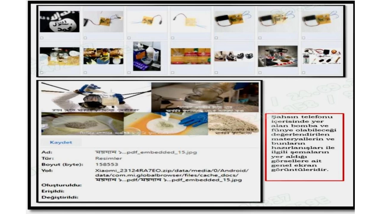 Şifreleme programları çözülen şüphelinin, patlayıcı madde yapımı, uzun namlulu silah sökme - takma eğitimi aldığına dair dosyalar ile silah atış eğitimlerine ait bulgulara ulaşıldı.
