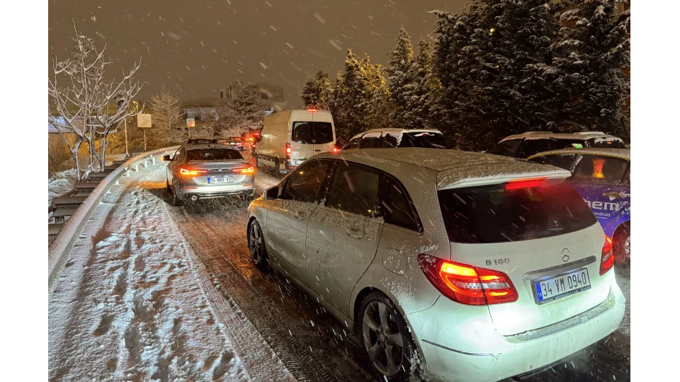 Sarıyer Büyükdere Caddesi'nde araçlar kar nedeniyle ilerlemekte güçlük çekerken, bazı araçlar da kayarak ilerledi. Kar, bölgede trafik yoğunluğuna da neden oldu.