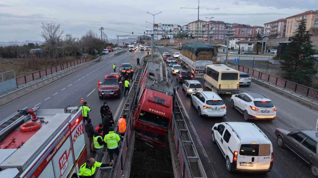 Kırıkkale'de bir itfaiye aracının kontrolden çıkarak iki köprü arasına asılı kaldığı kazada 3 personel yaralandı. Araç, köprü altında bulunan yüksek gerilim tellerine ulaşmadan sıkışarak durduğu için muhtemel bir facia önlendi